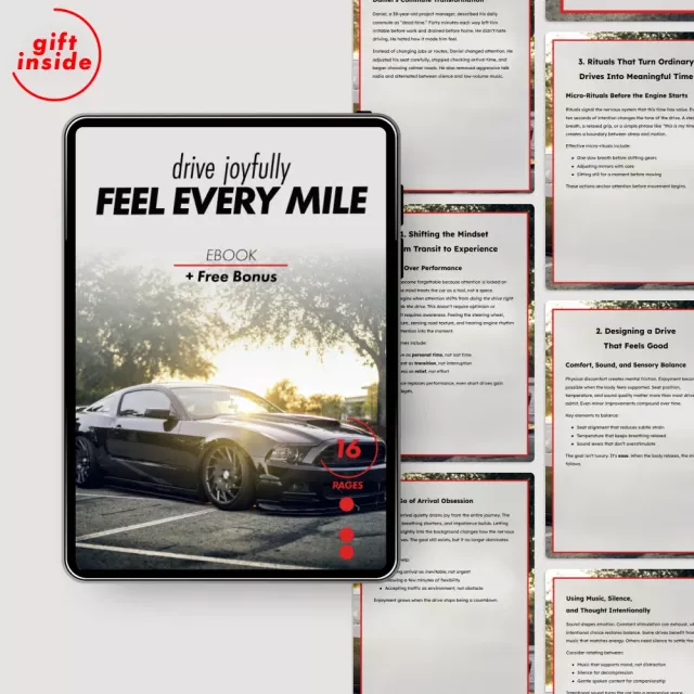 Driving doesn’t have to feel rushed, tense, or forgettable. Drive Joyfully, Feel Every Mile is a thoughtfully designed eBook that shows you how to really enjoy the drive—whether you’re commuting, running errands, or heading out on a long journey. Instead of treating driving as something to endure, this guide helps you transform it into a calm, meaningful, and even restorative experience. With simple mindset shifts, sensory awareness, and practical rituals, you’ll learn how to turn time behind the wheel into time that truly feels good.