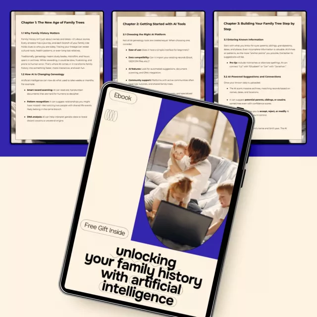 Unlocking Your Family History with Artificial Intelligence is a practical, easy-to-follow ebook designed to help you explore your ancestry in a smarter, faster, and more meaningful way. Whether you’re starting from scratch or working with scattered records, this guide shows you how modern AI tools can transform old documents, memories, and data into a clear, visual family tree. Instead of feeling overwhelmed by genealogy research, you’ll learn how to let technology do the heavy lifting while you focus on discovering the stories behind your ancestors.
